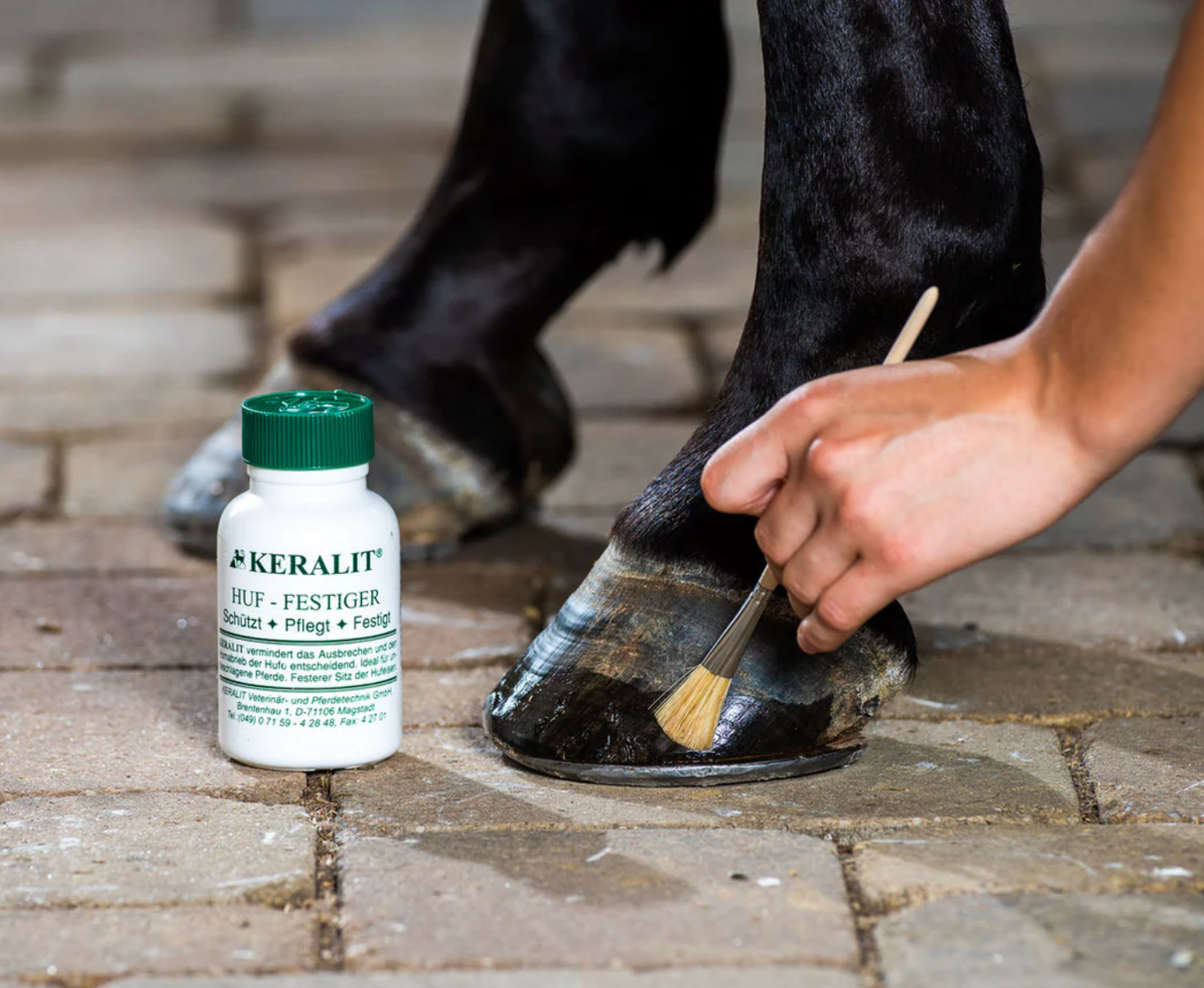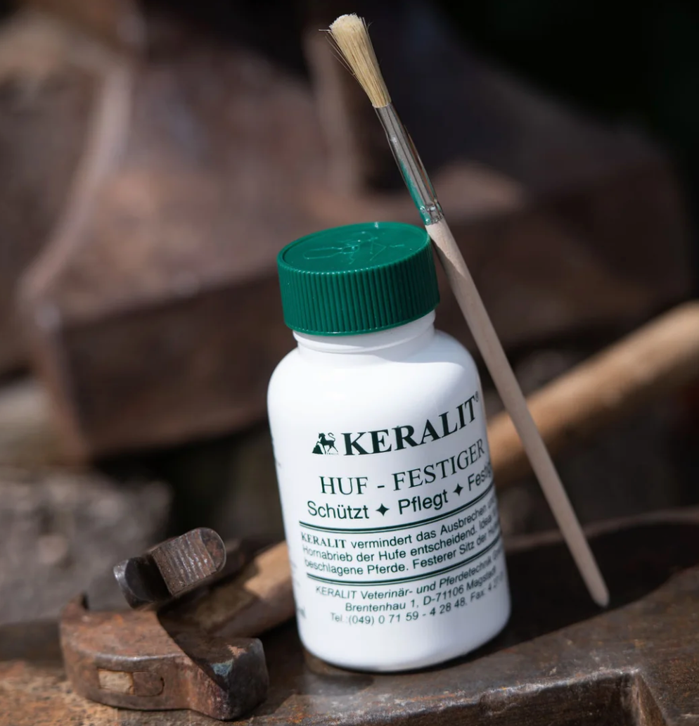 Durch die Anwendung des Keralit Huf-Festigers wird das Horn gefestigt und wesentlich strapazierfähiger. Bereits nach zweiwöchiger Anwendung bemerkt man in diesen Bereichen ein leicht glänzendes Aussehen des Horns sowie einen festeren Klang der Hufe auf hartem Boden. Der Hornabrieb barhufiger Pferde wird stark reduziert. Tragrand, Sohle und Weiße Linie werden wesentlich fester und belastbarer. Die Eisen beschlagener Pferde sitzen fester, der Huf wird geschont.